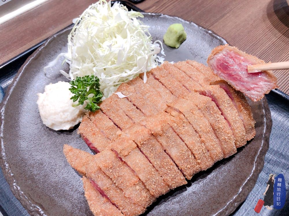 炸牛排只有表層一圈的表皮被炸得酥酥脆脆,裡面的牛排還是深粉紅色,還沒熟喔!