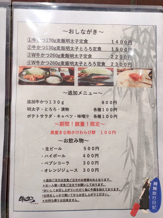 另外套餐還可以加點:炸牛排(130g)¥800、明太子、 山藥泥、日式醬菜、味噌湯等,每種分別都是日幣 ¥100 元。