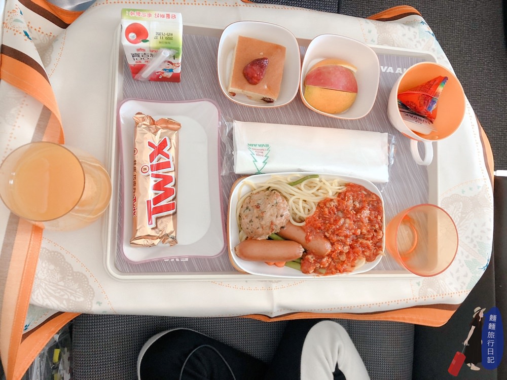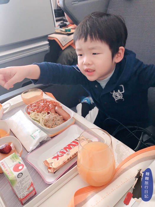 我幫波仔跟樂樂選兒童餐,兒童餐就跟一般的客機餐點內容一樣,肉醬義大利麵、水果麵包跟果汁、甜點是巧克力齁,應該幫他們選其他餐點的才對說~~~