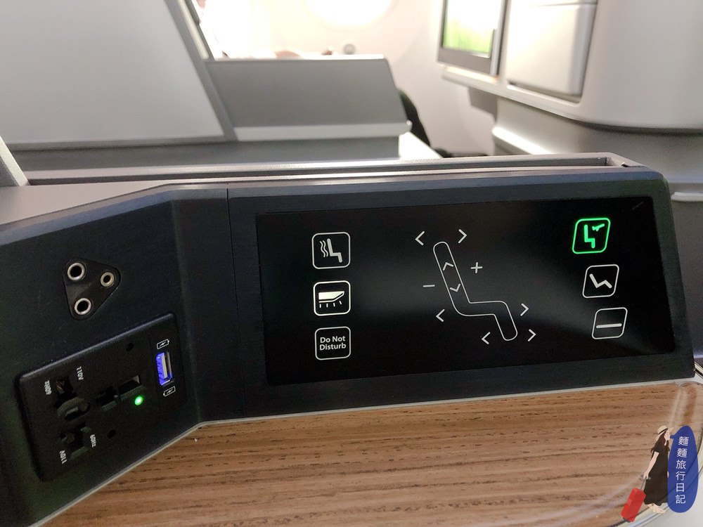 座位旁邊ㄎㄨㄚ手的地方(人家是桌子),左邊是複合式電源插座、右邊是調整座椅控制器,按鍵為觸控式,並設置三個座椅角度快捷按鍵,分別是:第一個是飛航模式、第二個是傾斜可往後舒服ㄊㄟ著、第三是完全平躺!!!另一邊則是按摩椅震動模式,但是只是前後震動而已,沒有很有感~~~下方是開燈、跟勿擾模式,暗下後按鈕會呈現綠色狀態。