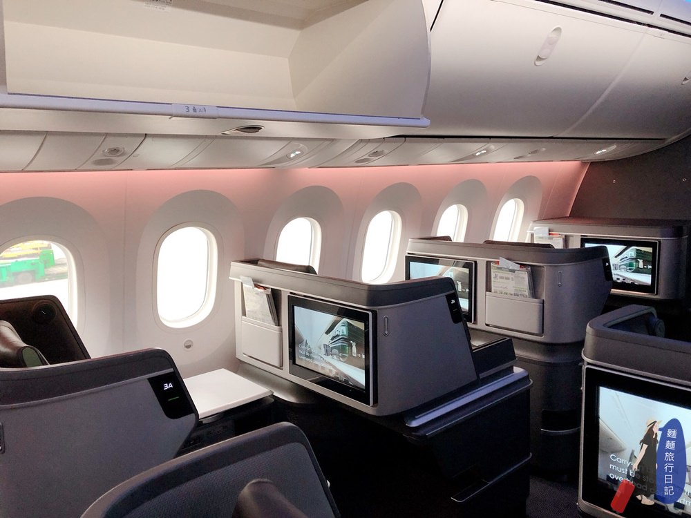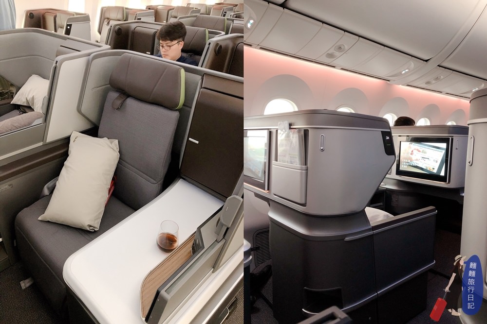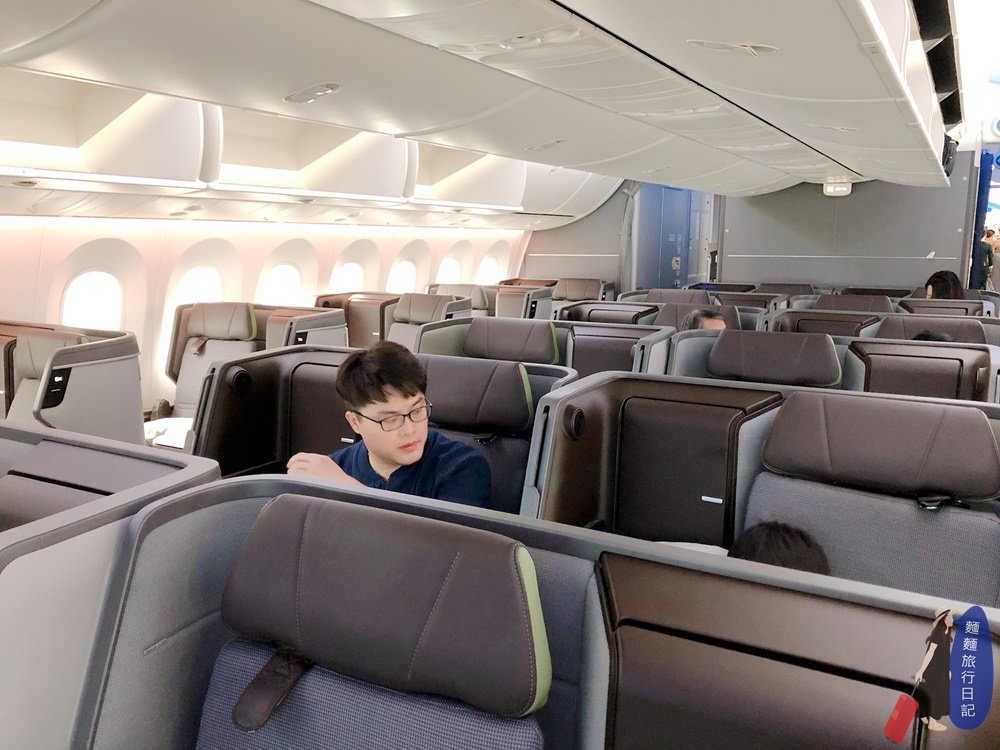 長榮航空總共買了24架787夢幻客機,目前787-9有4架、787-10也有4架,787-9客機有26個皇璽桂冠艙座位,278個經濟艙座位;787-10型客機則有34個皇璽桂冠艙座位,308個經濟艙座位,這次村長坐的是787-9的桂冠艙,787桂冠艙一排總共有4個座位,坐位採1-2-1規劃,座位很寬敞,之前我們一家4口排排坐、坐滿一排,座位太寬根本撈不小孩,這次學聰明了直接坐中間座位前後兩排,我跟樂樂坐、大猴跟波仔坐。