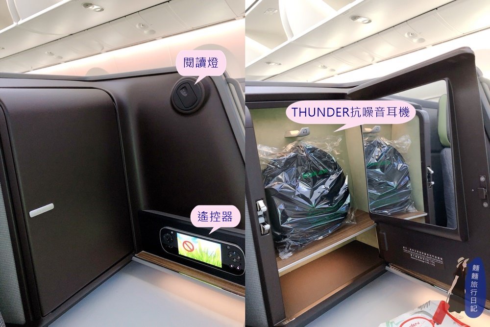 每個座位都有閱讀燈、遙控器(遙控器的解析度也很高!超清晰)、櫃子打開裡面可以置物外,還有附上THUNDER抗噪音耳機,話說抗噪音耳機完全沒用到,因為787夢幻客機起飛跟降落的時候比起一班的客機,聲音更小,更舒服~~~起飛降落也都很平穩(這是機長技術問題還是飛機功勞呢?應該都有啦XDD)。
