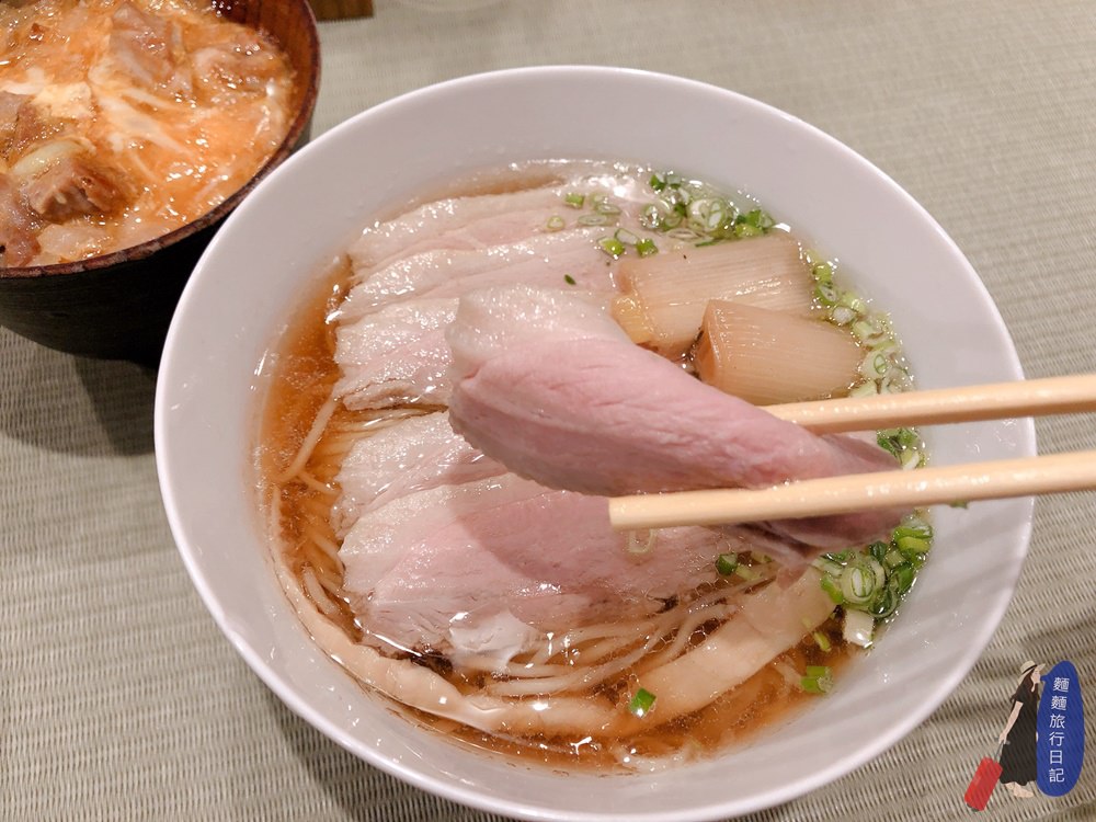 我跟大猴各點了一份套餐,一碗鴨コンフイ麵跟小份的親子丼,鴨肉是加量版的,鴨肉總共有6片,一整排油封鴨肉粉紅色蓋滿拉麵,旁邊還有白蔥段跟蔥花,拉麵裡除了蔥以外還有筍絲,鴨to蔥拉麵主打清爽鮮甜的湯頭,麵一上桌就有一種很高雅的感覺、湯頭看起來很清澈,鴨肉的狀態看起來就非常好吃,一碗拉麵怎麼會如此漂亮啊(我是不是瘋了,居然用漂亮跟高雅形如一碗拉麵)。