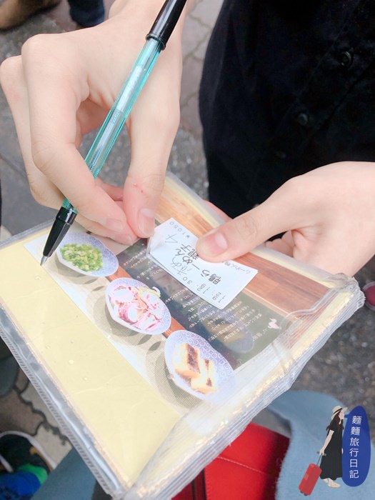 店員會出來收剛剛的點餐票眷,收的時候會詢問要哪種蔥,總共有三種蔥可以選,有照片可以看不用怕看不懂,不會說日文就用指就好,從右至左分別是丸大白村、紅洋蔥跟蔥花。