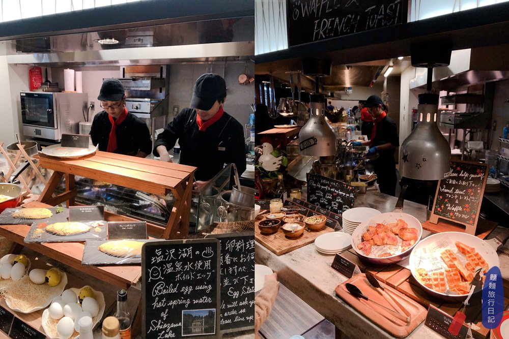 自助早餐區提供各式各樣的蛋料理,雞蛋前面還會有一個黑板寫,今天雞蛋是使用當地的溫泉煮的叭啦叭啦叭啦等資訊,另外歐姆蛋是現點現煎,熱騰騰的,蛋軟呼呼看起來很好吃。