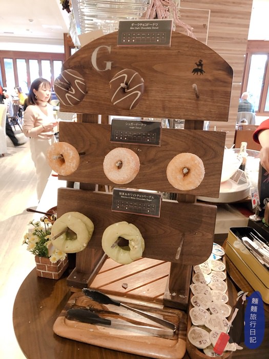 放甜甜圈的木板設計成這樣超級可愛,直接將圓呼呼的甜甜圈掛在上面供客人拿取。