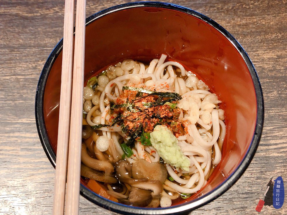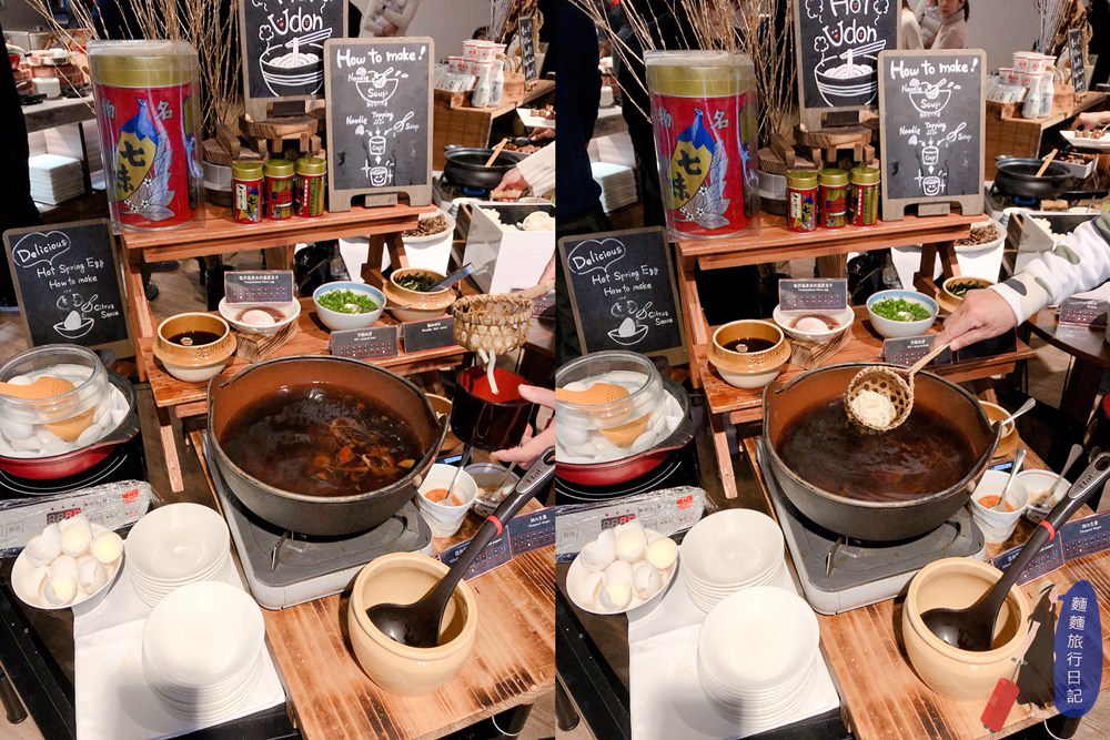 這是熱蕎麥麵 or 烏龍麵,我第一天去吃早餐的時候是蕎麥麵、第二天是烏龍麵,吃法是把蕎麥麵 or 烏龍麵放到竹編湯匙裡面,然後放進湯鍋裡面加熱,加熱後把熱呼呼的麵放進碗裡,加上上方的蔥花、海苔、七味粉、芥末等(可以依照個人口味放想吃的調味料),最後要加一點剛剛加熱烏龍麵的湯,那鍋湯裡面有很多紅蘿蔔、菇類,應該是用蔬菜煮出來的高湯。