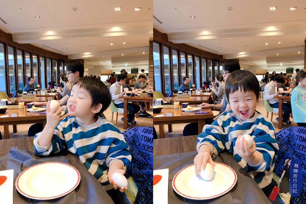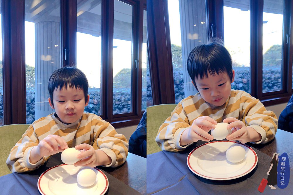 我們一入座馬上拿了水煮蛋給波仔跟樂樂吃,因為水煮蛋要撥殼,他們會乖乖坐在位子上,很認真地剝殼、吃蛋。
