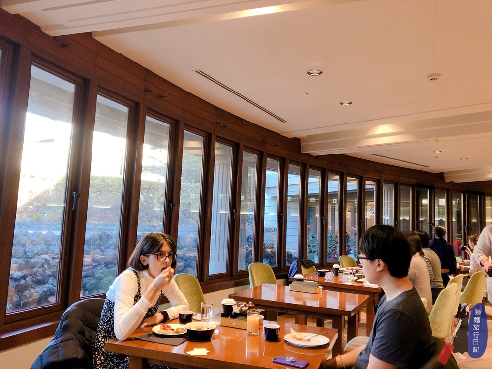 餐廳有一整排靠著景觀窗的座位區,房客裡的溫泉會全部流到餐廳外的小池子裡,就像一個又一個的小瀑布,日本冬天戶外很乾冷,熱呼呼的溫泉流到這裡後,接觸冰冷空氣會變成煙霧瀰漫的水蒸氣,坐在窗邊可以一邊欣賞窗外景色一邊享用早餐。