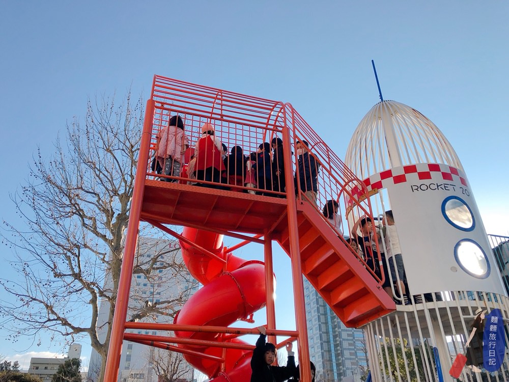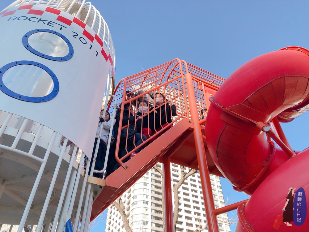 村長是周日天氣晴朗好天氣的下午帶波仔跟樂樂來錦系公園玩溜滑梯的,恩….大概所有的錦系町的父母都帶著小孩來錦系公園玩了吧,超多人啊!波仔跟樂樂溜個溜滑梯都要排隊,小屁孩擠小屁孩,這個溜滑梯遊樂設施其實很大,有很多入口可以進入,火箭造型溜滑梯很特別,兩邊各有一個紅色跟黃色的旋轉式榴滑梯,紅色的超級高,小孩超多要排隊才能溜,除了溜滑梯還有立體格子鐵架讓小孩可以爬格子、盪鞦韆、爬網繩、走獨木橋等,地板上是沙地,所以小孩如果不小心跌倒可能會滿身是沙。
