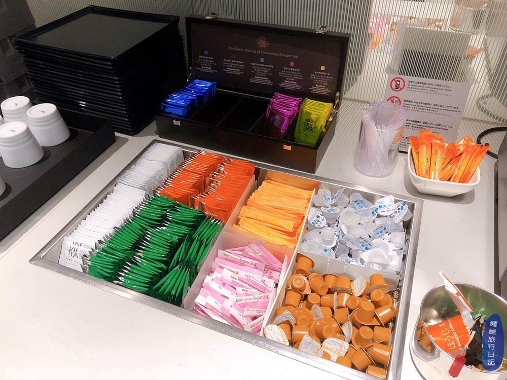 飲料區一旁有很多茶包、奶精、糖粉,應有盡有。