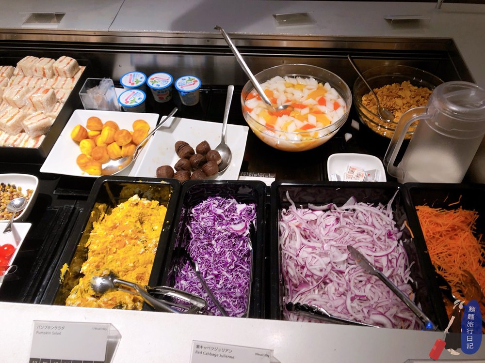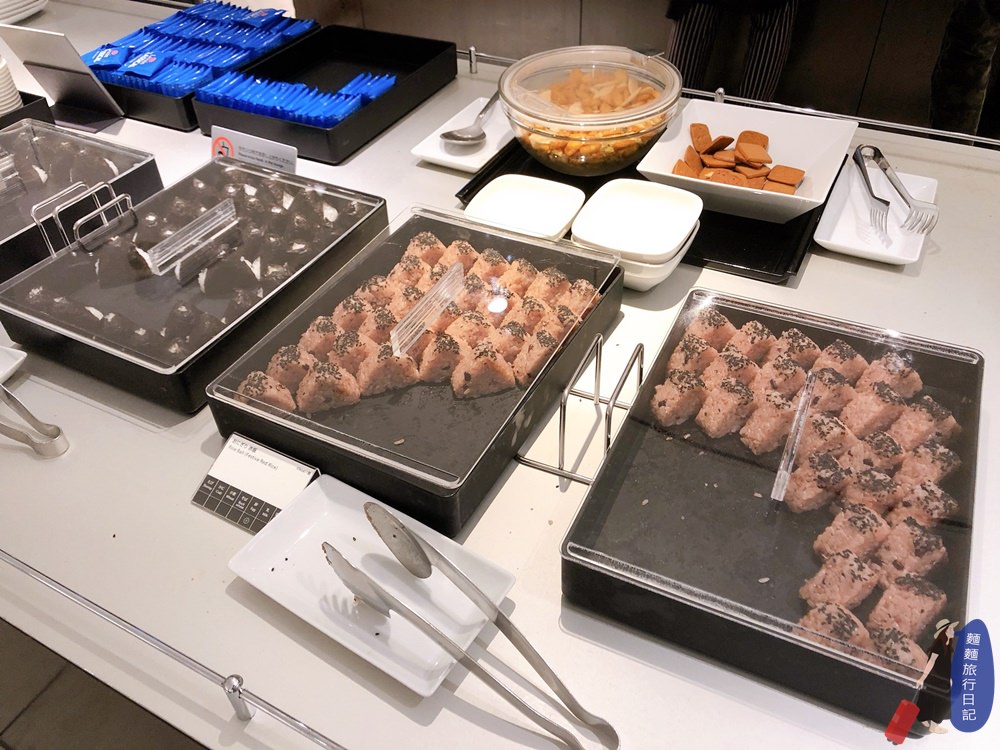 全家人都飢腸轆轆的狀態下,貴賓室裡的自助食物區滿滿的食物才讓我們感興趣,因為座位區分成前後兩區,所以食物區也是前後兩區都有,很貼心的設計,不用走太遠!因為我們已經餓了半天,所以像餓死鬼投胎一樣,吃超多吃不停,吃飽飽後才登機回台灣。