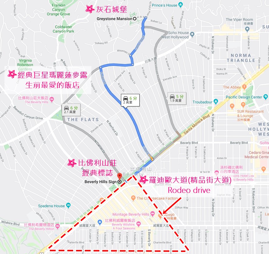 從灰石城堡到比佛利經典標誌只需6分鐘的車程,路途間還可以繞去洛杉磯百年地標粉紅供宮殿「比佛利山莊飯店」拍個照 這間飯店可是已故巨星瑪麗蓮夢露和美國著名演員伊莉莎白·泰勒蜜喜愛的飯店!拍完比佛利標誌打卡景點照後,標誌前面就是著名的羅迪歐大道(精品街大道)Rodeo drive ,拍完照直接逛起街來(誤)~ 羅迪歐大道裡的比佛利威爾希爾飯店 Beverly Wilshire Hotel則是經典電影《麻雀變鳳凰》的拍攝場景唷!