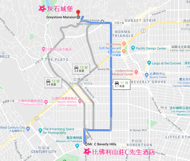 我們在洛杉磯比佛利山莊區選擇入住C先生酒店 Mr. C Beverly Hills(超時尚復古義式五星級酒店),灰石城堡從酒店開車只要11分鐘的車程,超近。