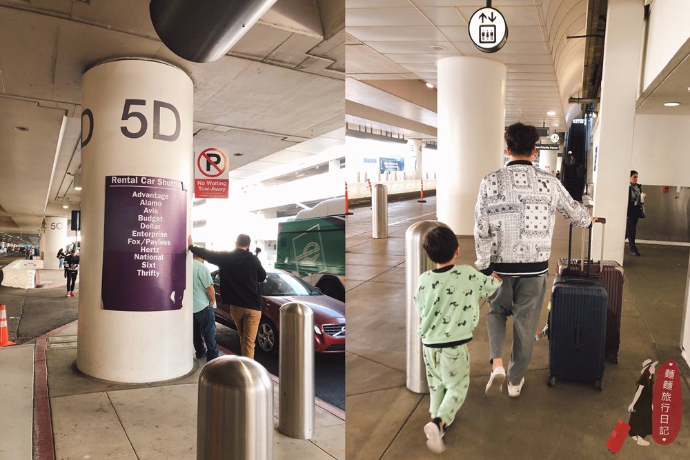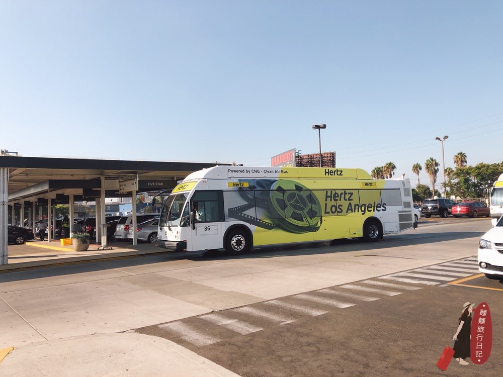 我們租Hertz的取車地點是洛杉磯機場,LA的租車公司都在機場外圍,不是在機場裡面,所以下飛機領完行李出境後要跟著機場紫色的指標Rental Car Shuttles走到5D,搭乘接駁車前往租車公司辦理租車手續,幾乎所有租車公司的接駁車都在這裡候車。