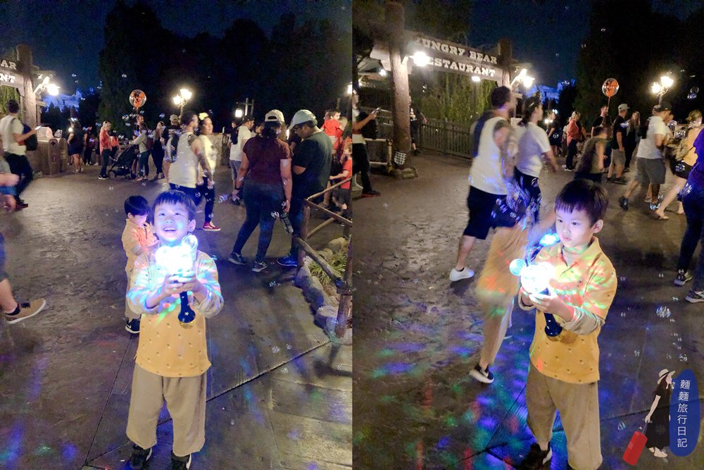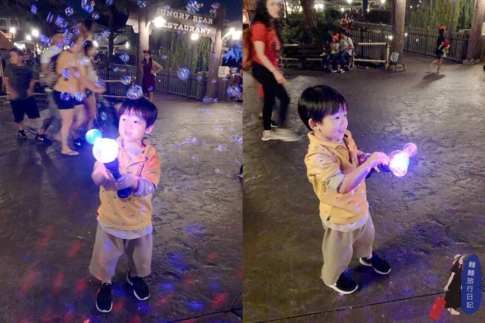 然後我忍不住買了這個,米奇發光泡泡機給他們!場面就整個失控了!