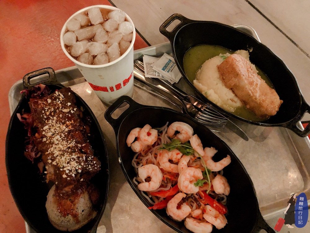 登等!這是我們的晚餐,我點了….Endorian Fried Chicken Tip-Yip $ 15.49、蝦仁麵條沙拉 Yobshrimp Noodle Salad $15.99 、熏卡杜豬肉排骨 Smoked Kaadu Pork Ribs $ 16.99 、噴泉飲料 Assorted Fountain Beverages – Regular $ 3.99,這樣居然要60美,就跟妳說坑爹吧!