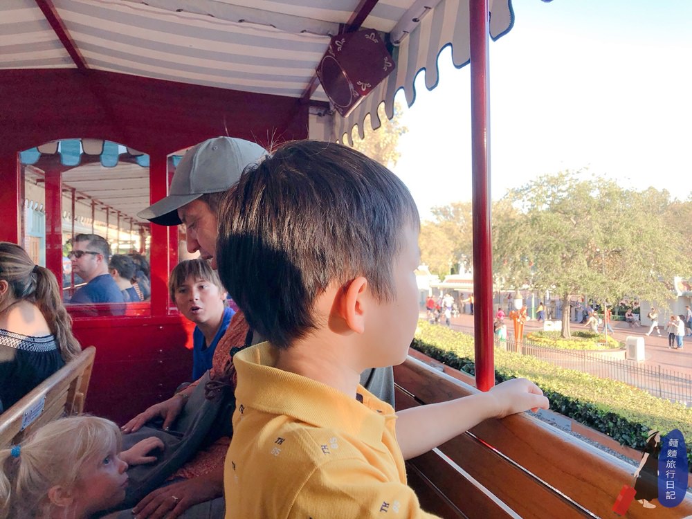 搭乘蒸氣火車可以環遊迪士尼樂園一圈,搭乘時間要18分鐘,讓波仔邊看風景邊休息一下,樂樂就睡一整路,下車的時候大概就會醒來了吧。