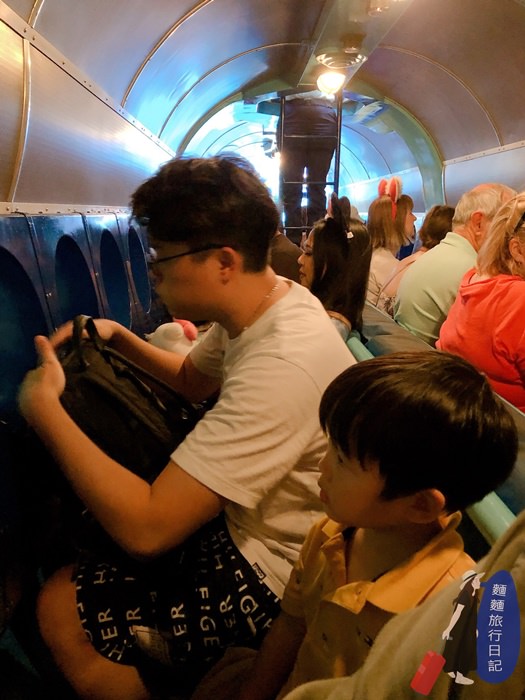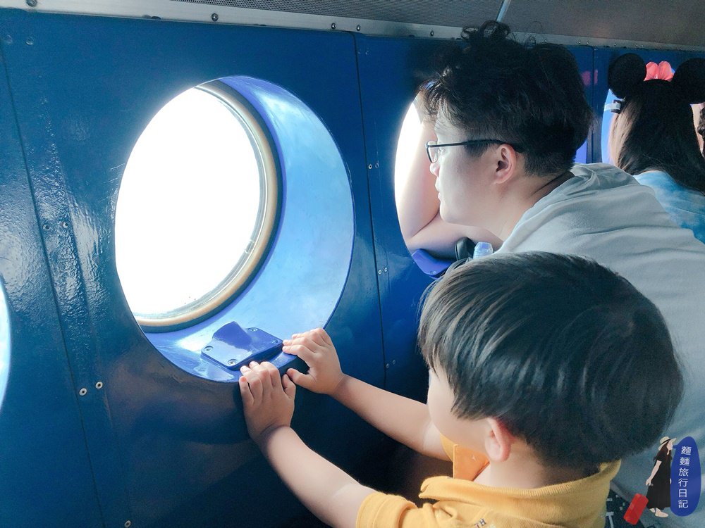 進入潛水艙裡後,找好位子坐下,我們準備潛入水中啦!每個座位前方都有一個透明的玻璃窗可以看到海底世界,樂樂目不轉睛地盯著前方的透明玻璃窗。