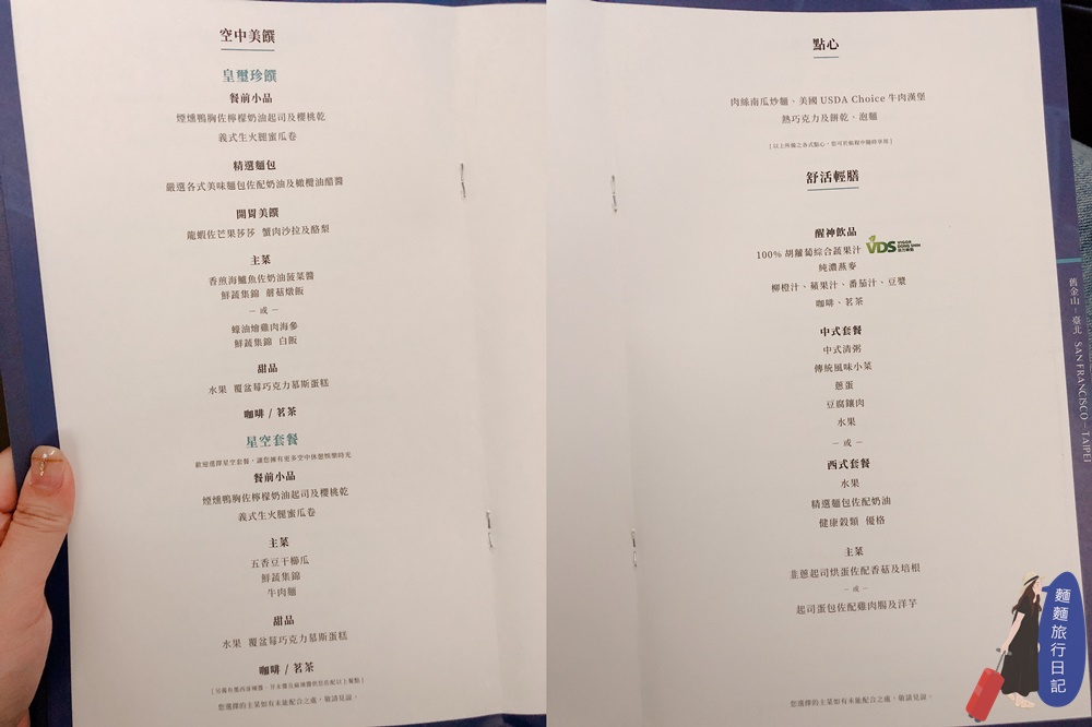 在飛機上的午餐菜單通常只有兩三種選擇,分成中式跟西式,中式通常是鼎泰豐、西餐就有牛排等排餐啊!