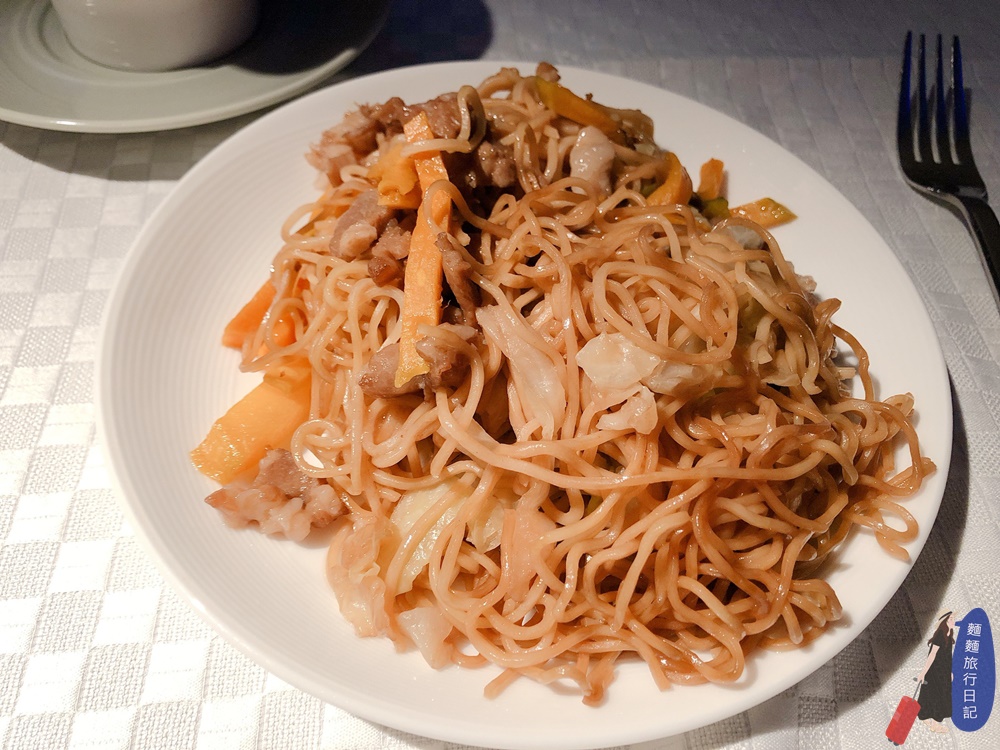 裡面有高麗菜、肉絲、香菇、南瓜,麵條是細麵,滿好吃的!就像台灣小吃店現炒一樣。