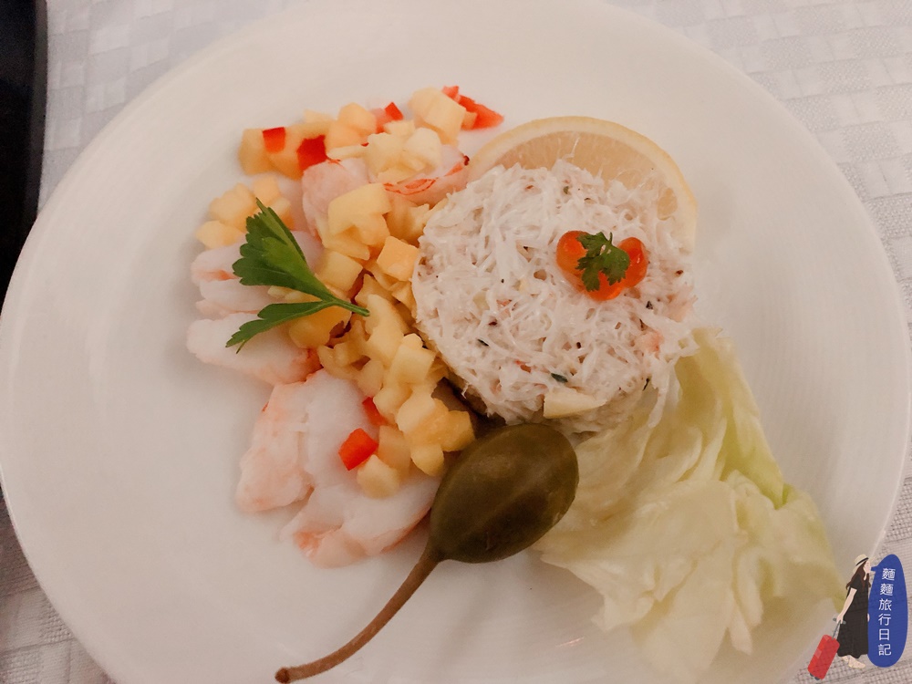 開胃菜是龍蝦佐芒果莎莎跟蟹肉沙拉,那一坨滿滿的美乃滋蓋住的就是蟹肉啦!