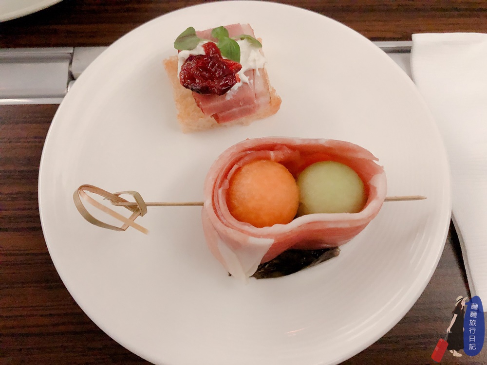 前菜是煙燻鴨胸左檸檬奶油起司及櫻桃乾、義式火腿蜜瓜捲。