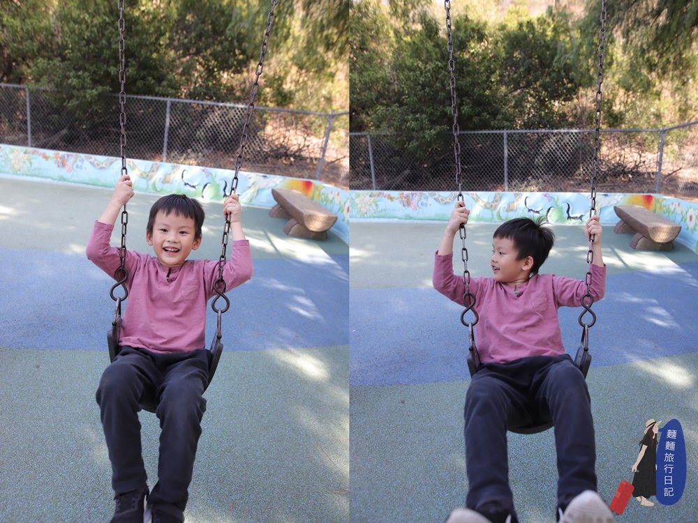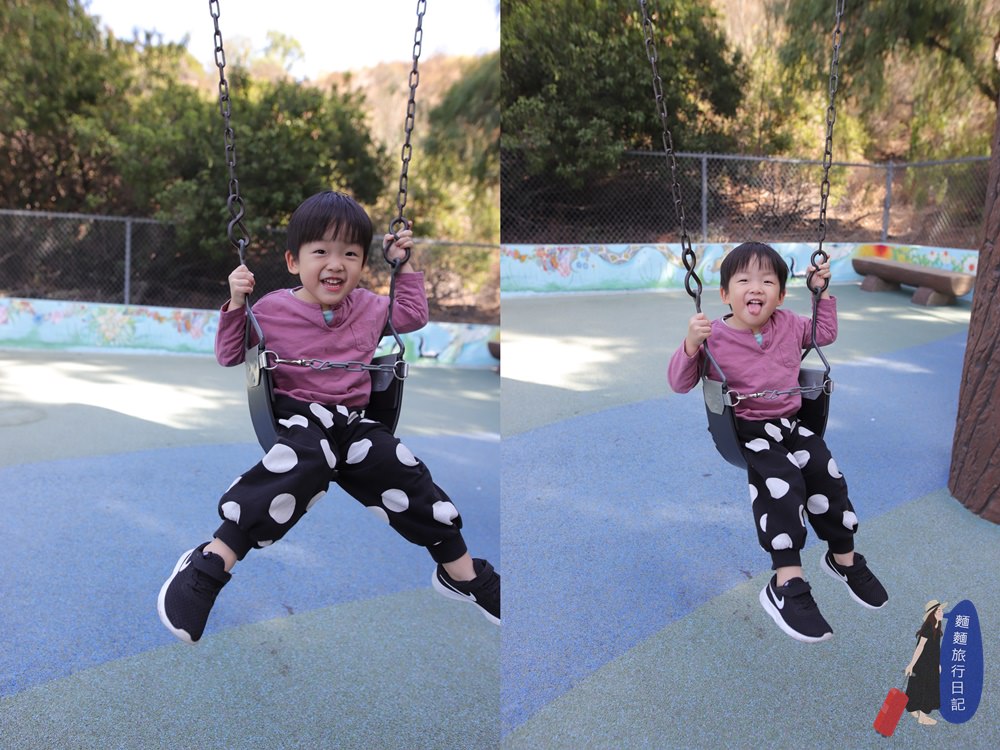 LA的盪鞦韆有安全帶欸!這設計簡直太棒了,每次樂樂玩盪鞦韆我都提心吊膽,怕他會掉下來(因為他腿還太短勾不著地)(哈哈哈壞媽媽),多一個安全鍊多點安心啊~