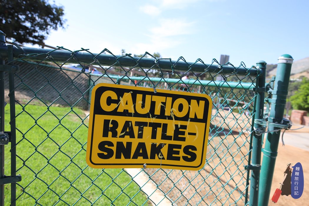 就在媽媽緩慢地走過去遊樂設施時,在門上看到小心響尾蛇出沒的告示牌(驚)😱,太可怕了,大家來玩也要注意唷!