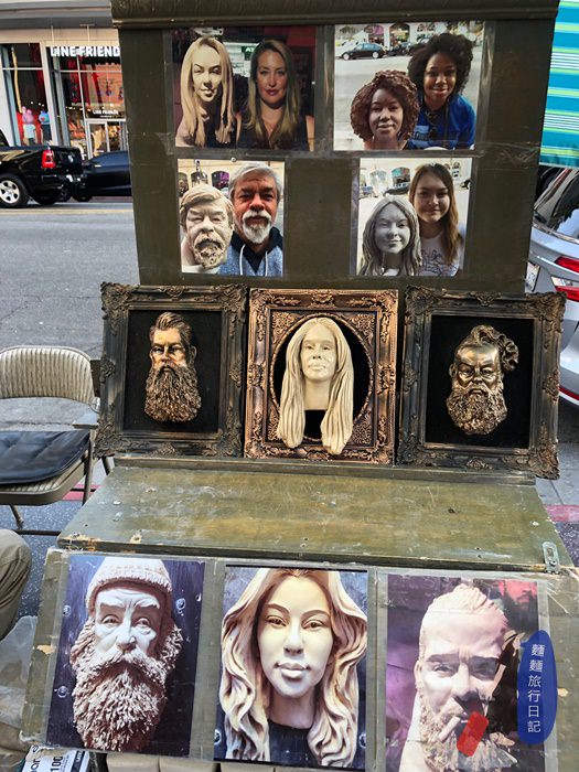除了街頭拍照藝人外,還有很多街頭藝術家,但是因為LA的太陽實在是太曬了(雖然不是夏天),幾乎沒有亞洲人會坐在那裏超過1小時,讓畫家畫~我看到比較特別的是這個像是捏陶人一樣,照著你本人的模樣捏出來的人像,超強的~