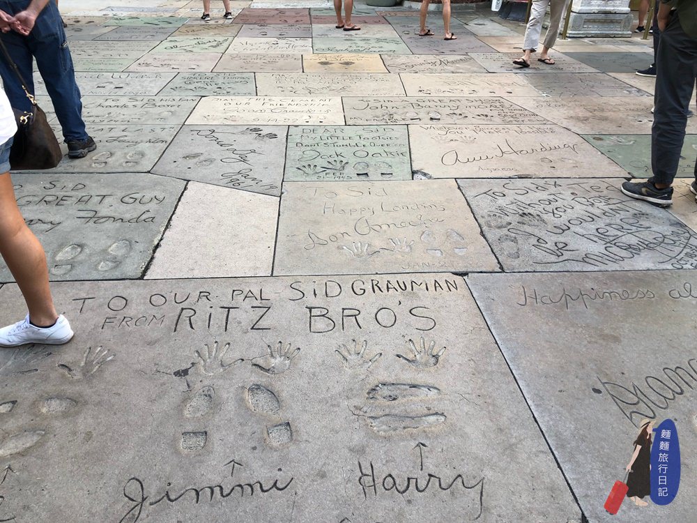 中國戲院門前一個小小廣場,地上滿滿都是印有明星手、腳印和簽名的紀念水泥地,大家都很專注低頭在尋找大明星的手印及腳印😂,網路上說留腳印傳統是因為在建造戲院的時候,因為水泥未乾有一個工人不小心踩進去留下腳印,而得來的靈感。因為這個美好的意外,讓地面上滿滿的都是名人的手、腳印。(哈哈哈)(超多)(簽名牆移到水泥地的概念)