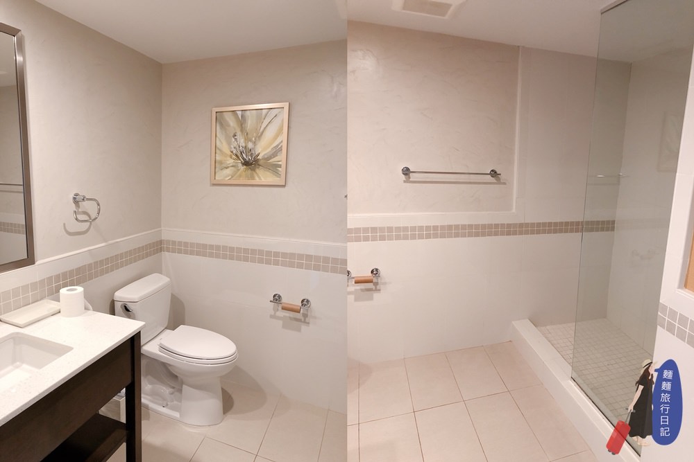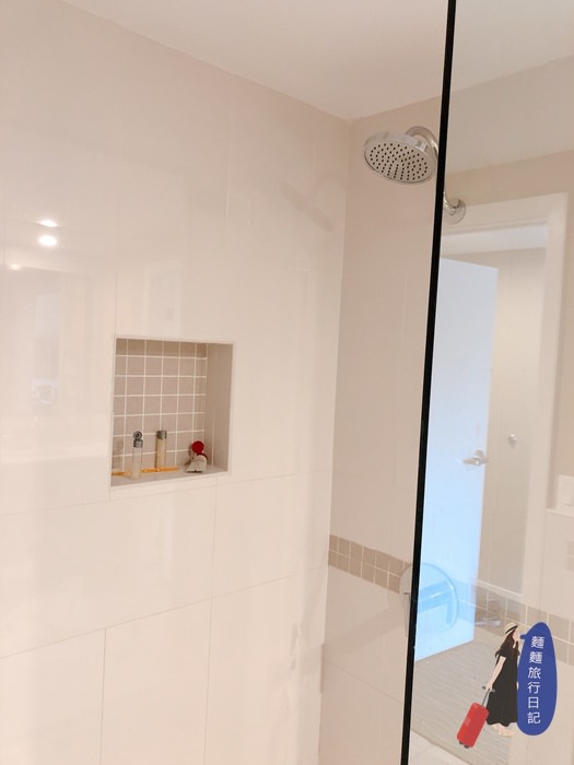 淋浴間一樣是這種懸掛在高高牆壁上、無法拔下來的蓮蓬頭,我們家的鏟屎官大猴氣得牙癢癢,或許可以請他分享在LA如何幫小孩洗屁股??!!!(幸災樂禍)