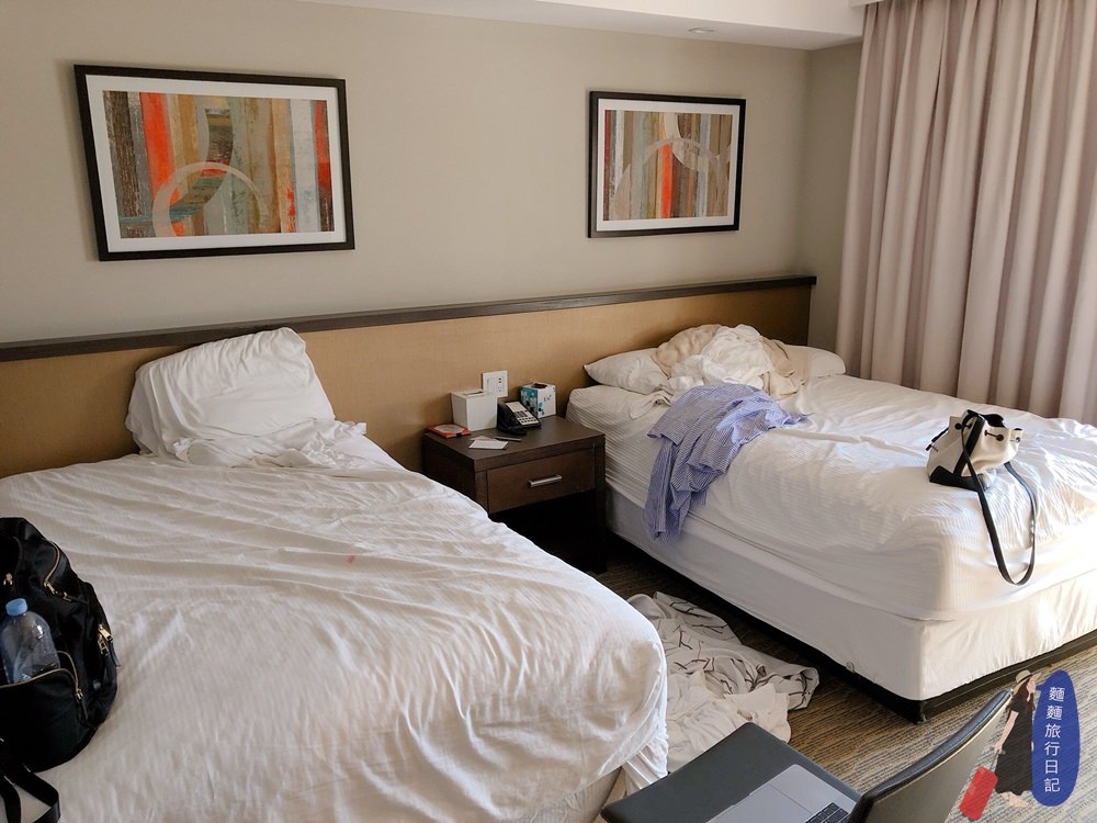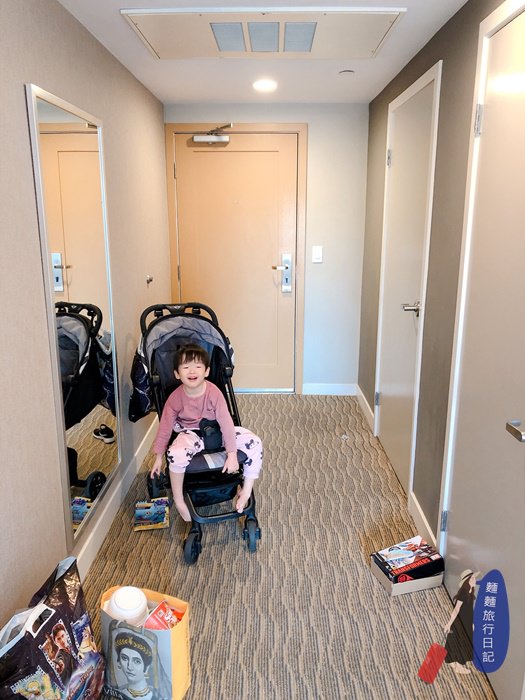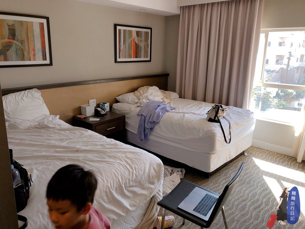 我們住的房間不大,有兩張雙人床,床跟你去日本或韓國玩時住的飯店一樣小巧玲瓏😂,我跟大猴都比較大隻,所以一人帶一個小孩睡一張雙人床,勉強綽綽有餘囉!但是房間被我們弄得亂七八糟,有一天我們回飯店看到這副景象,還大吃一驚想說是怎樣?遭小偷嗎?結果冷靜下來發現不對,出門前就是這副鬼樣了!是在哈囉~搞不好小偷真的闖進來還會想說 喔~原來這間已經來過了🤣🤣🤣