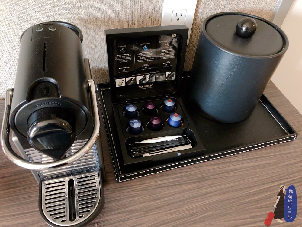 另外床前有書桌跟茶水桌,有附膠囊咖啡,商務飯店房間不能沒有咖啡啊,覺得有膠囊咖啡還不錯欸。