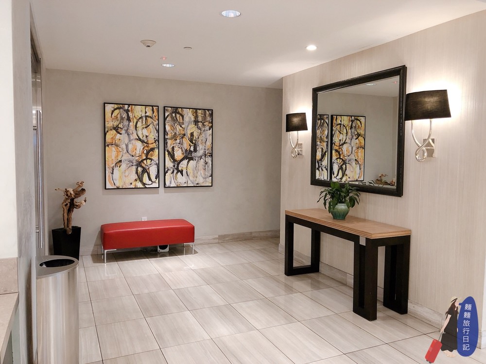 電梯前面也擺了一面鏡子,很喜歡這樣的空間布置,讓飯店看起來更明亮寬廣許多,牆上從剛剛的大廳座位區到電梯前,都掛這種類似水墨的抽象派掛畫?!!!(胡說八道一通)(一副很懂藝術,明明就一竅不通🤣)