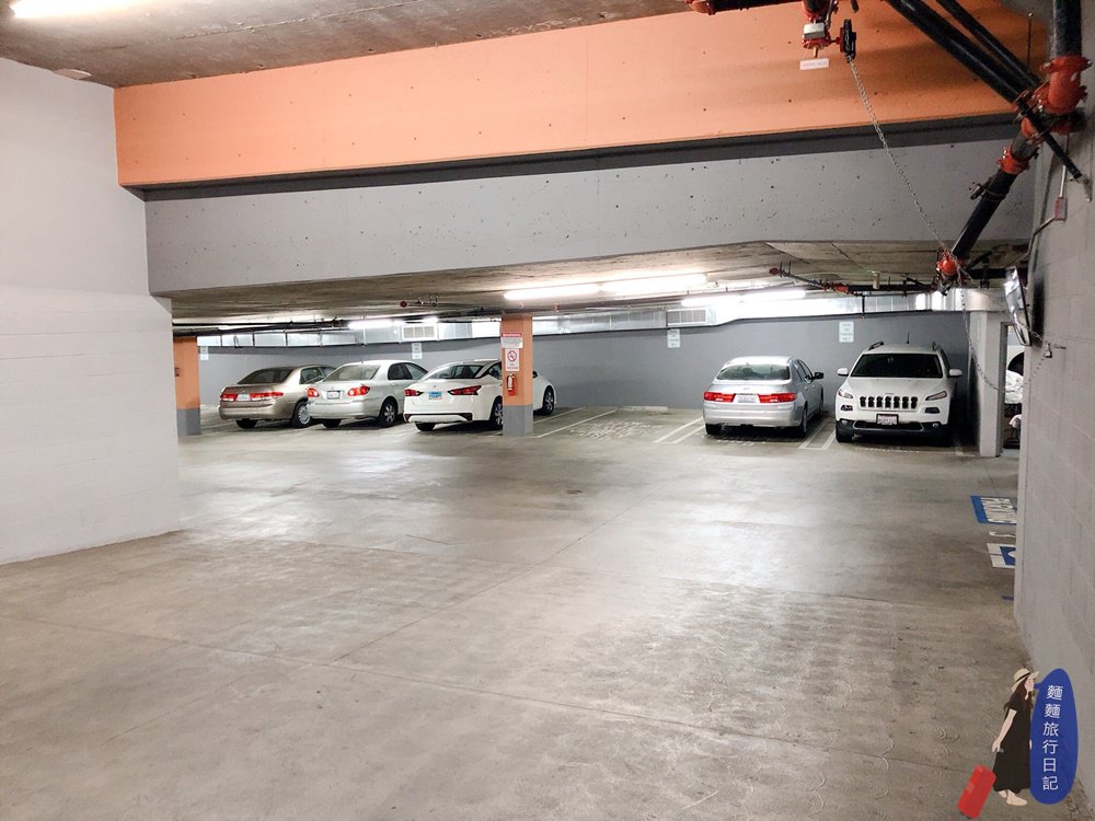 地下室超級大,這個飯店有停車場真的是很棒的服務,為什麼呢?第一因為美國的停車費不便宜啊!隨便停一個晚上錢包裡的錢又會飛個幾張走了(嗚),第二是因為雖然住韓國城生活機能比較好,但是距離LA市中心很近,才5公里的距離、離好萊塢6公里,還記得露易絲一直嚇唬我LA Downtown治安有多差嗎?我是臭俗辣無誤,現在只要開進市中心我大腦就會警報大響,隨時注意!(是有被害妄想症嗎😂),有專用的室內停車場省去停車費之外,只要把車子開進地下室,就能直接搭電梯到大廳跟房間了,超級安全啊,所以飯店有專屬停車場是不是好棒棒~~~可以直接開進停車場,還有誰能搶我包!哼~