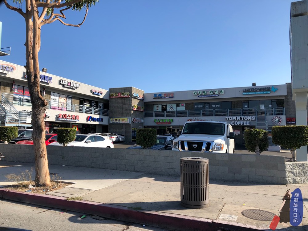 韓國城在LA市區的downtown西邊這區,這裡是韓國以外最多韓國人居住的地方,洛杉磯的韓國城是全美最大的韓國城,區內有許多韓國的餐廳、酒吧、咖啡店、商店、美容院等等,我們住的飯店轉角出去就是韓國城,住在這裡是為了吃各式各樣的韓國料理無誤,韓國城有很多這種幾家店面、餐廳連成一排或一個ㄇ字型,然後前面一小區塊的空地就規劃成停車位,所以要來吃飯的話停車很方便喔!