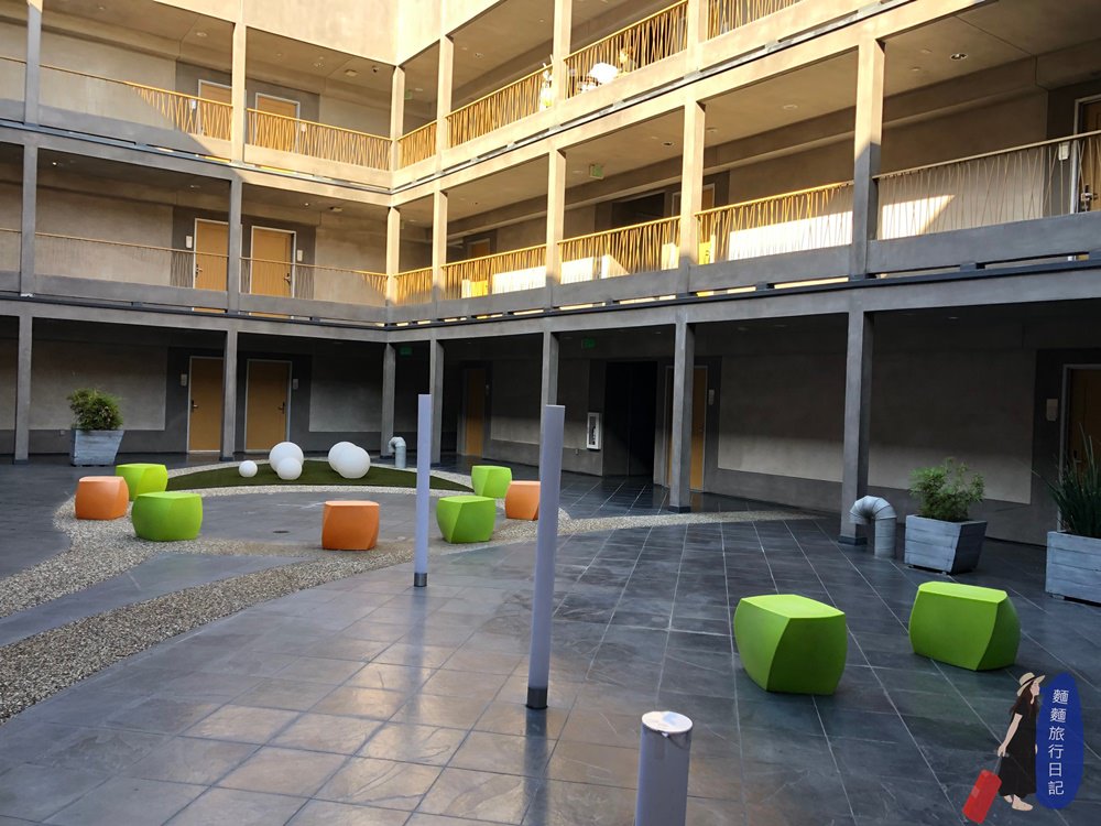 飯店房間分別在3、4、5樓,我們住的房間在3樓,電梯上來後走出去長這樣,有一個露天的廣場,等於我們房間走出來就直接是這片可愛的小空地了,我好喜歡這個設計喔!等於說只有房客才能進來這個戶外露天空間,在LA市區中飯店裡設計一個像庭院般的公共空間真的很貼心,可以安心的讓小朋友在這裡跑跑跳跳、不會有車子或是奇怪的人靠近小孩。