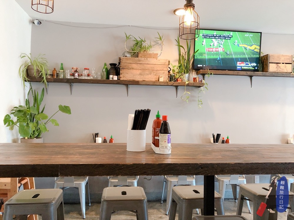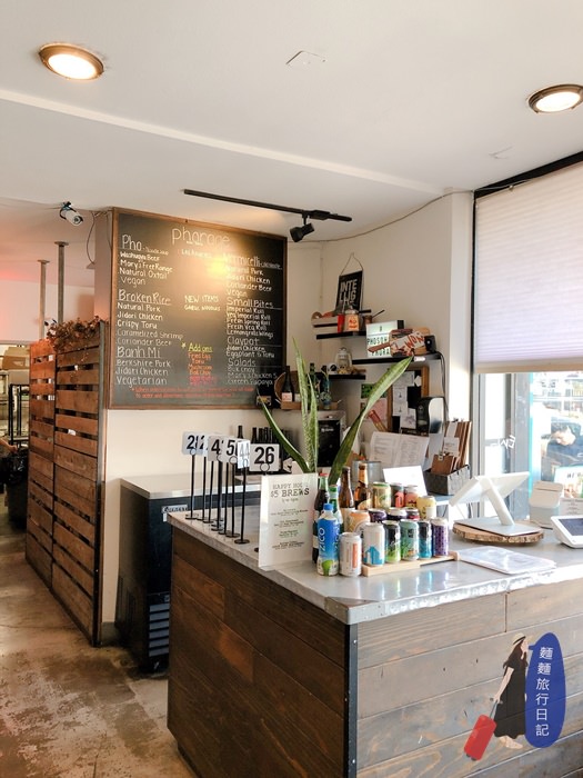 餐廳的裝潢是這種輕工業風,櫃台後面掛了一個黑板寫滿菜單,有越南河粉、越南春捲、越南三明治跟越式米飯還有飲料可點,決定好吃什麼再到櫃台點餐即可,點完餐後服務生會給你一個號碼牌,點餐方式跟摩斯很像。