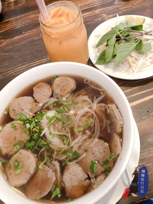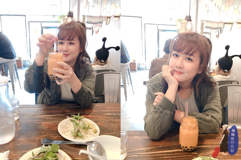 不知道為什麼越式餐廳的菜單上會有泰式奶茶😂,但是我很想喝所以就點一杯來嘗鮮,沒想到點餐的時候服務員還問我要不要加BOBA,BOBA是珍珠,心裡超驚訝,什麼啊超級專業,我是在飲料店點珍珠奶茶了嗎(誤),我這個手搖飲嚴重癮的人,當然馬上說要,幫我加珍珠,謝謝~我還問他可以調甜度嗎?因為泰奶是加煉乳,我怕會太甜啊!(還真的當自己在手搖飲料店咧😅),結果當然是不行啦!美國很多餐廳的飲料都是調好固定甜度喔!