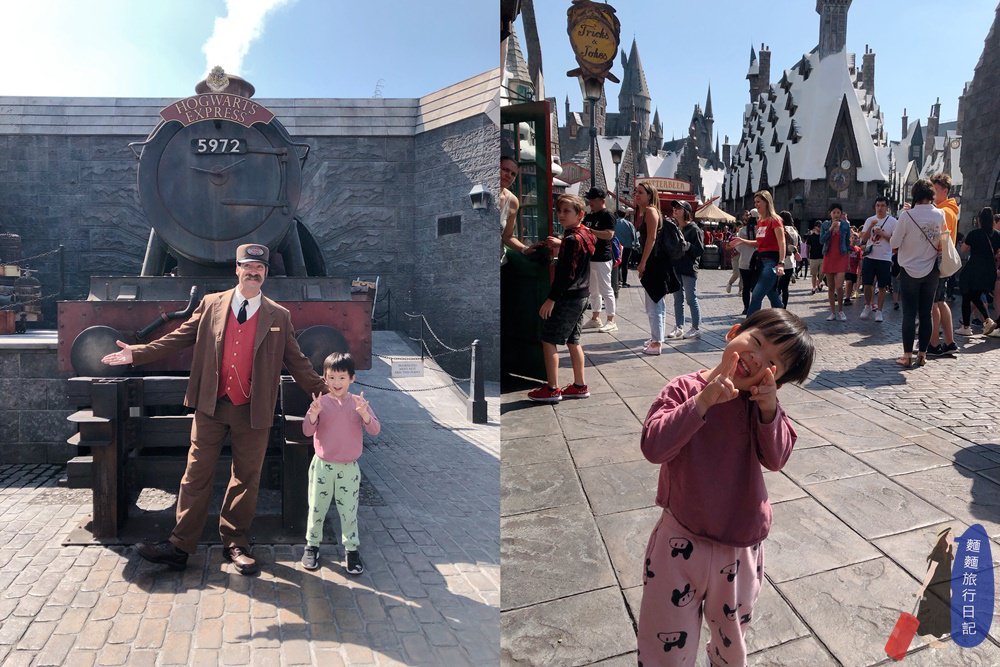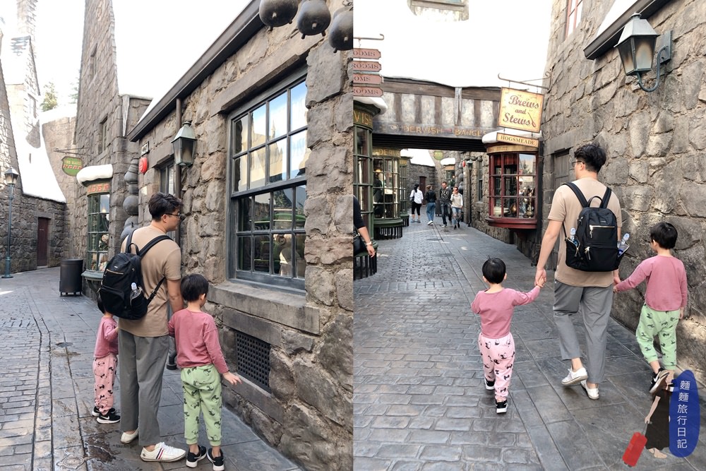 看完小小兵後好不容易把失控的波仔跟樂樂撈回來,馬上衝來哈利波特的魔法世界的活米村,哈利波特魔法世界離正門口最近,大家想完這區的設施建議一進來立馬衝去排隊,我們沒玩遊樂設施只是走走逛逛、體驗電影裡的魔法世界。