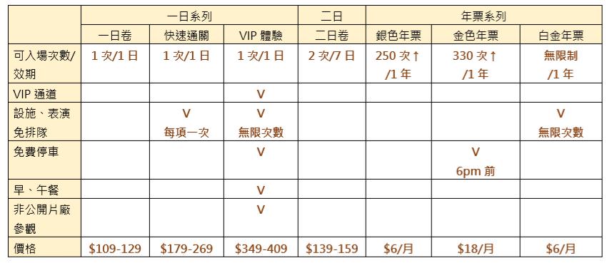 ※上表價格為美金,淡季與旺季價格會有異動,確定前往日期後請上官網查詢當天門票價格,以官網價錢為準,本表僅供參考。