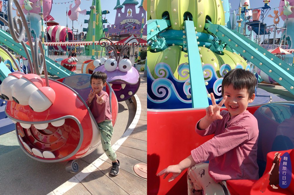 環球影城裡面這裡最適合給小孩玩,是一個色彩繽紛的遊樂設施區,有分水上設施跟陸地上的設施,搭了超無殺傷力的遊樂設施。