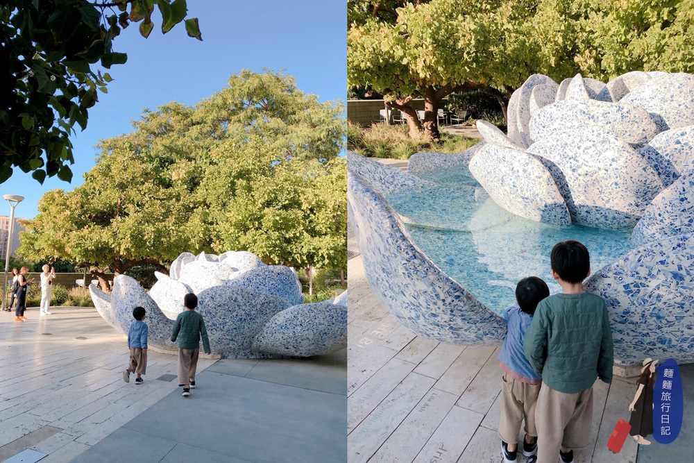花園裏面的莉蓮·迪士尼紀念水景Lillian Disney Memorial Fountain,是設計師 蓋瑞 Gehry 送給華特迪士尼老婆莉莉安.迪士尼 Lilian Disney的禮物,因為華特迪士尼音樂廳是莉莉安以華特迪士尼之名,捐出五千萬美金(約十六億台幣)打造出來的表演廳,於是設計師 蓋瑞 Gehry 打破了莉莉安Lilian 生前最愛的瓷器,用打碎的美麗瓷器蓋了這座玫瑰池。沒!錯!是玫瑰花的形狀~尖!叫! 我好喜歡這朵玫瑰花水池、喜歡這位設計師創意!