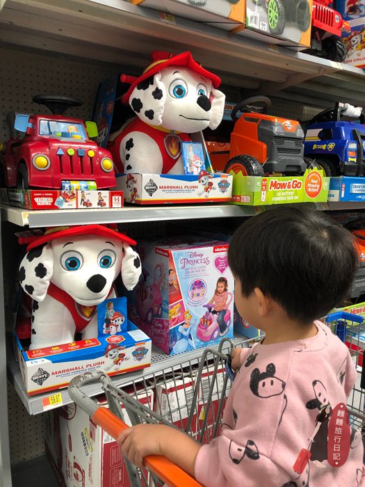 美國的超市基本上都會有停車場,超市前面就是一片寬闊的停車場,滿多車的。忘了說村長一直以來的小習慣,就是不管去哪個國家旅行,都會讓波仔跟樂樂自己選一樣玩具帶在身上也算是當成買紀念品,這樣小孩比較不會吵鬧喔!玩玩具的時候,也比較不會找媽媽😅 (哈哈哈)