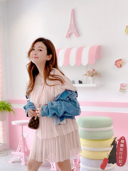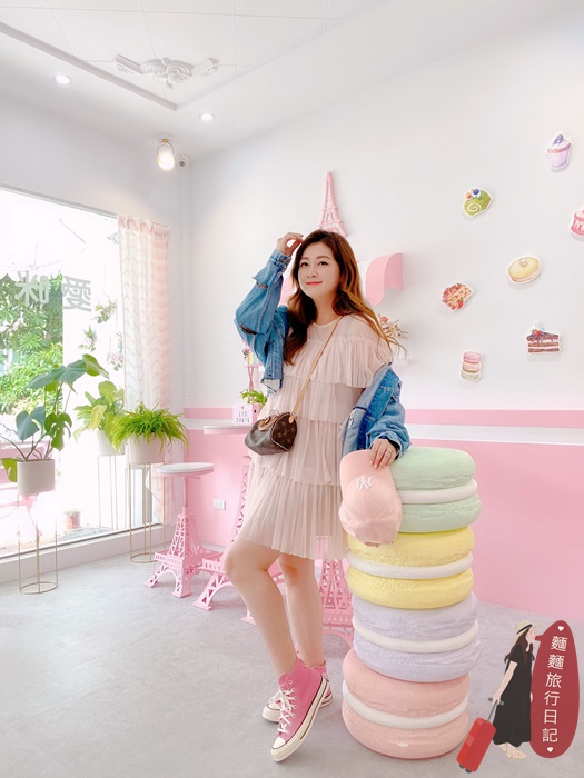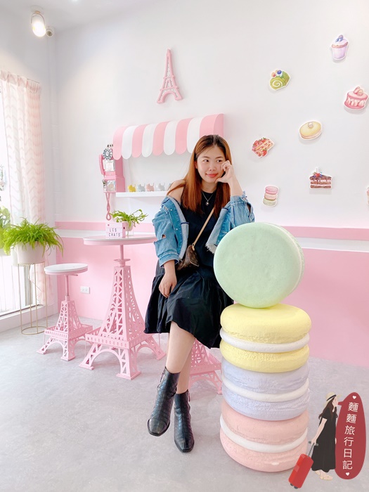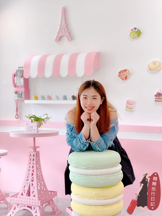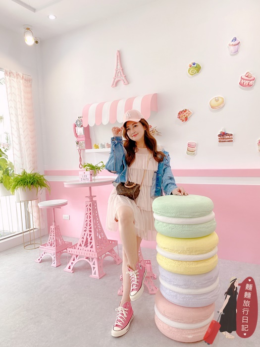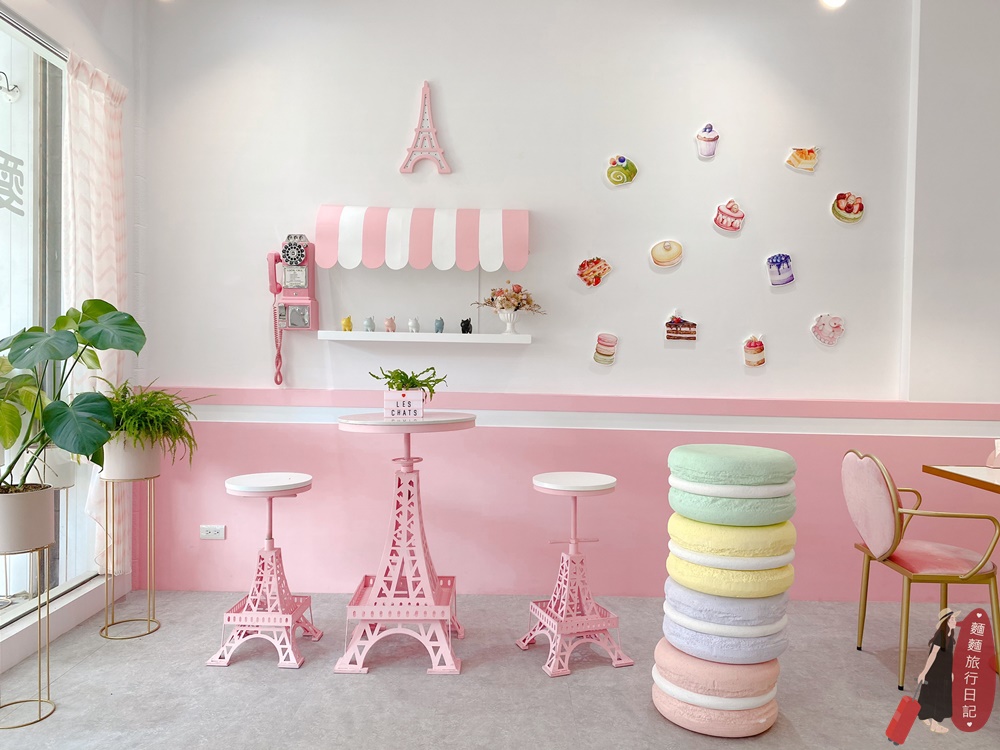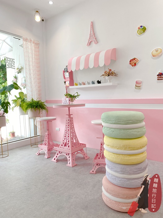 前面有一區拍照區!桌椅的腳都是粉紅色的巴黎鐵塔造型,加上粉紅色電話亭跟繽紛馬卡龍造景!超好拍~