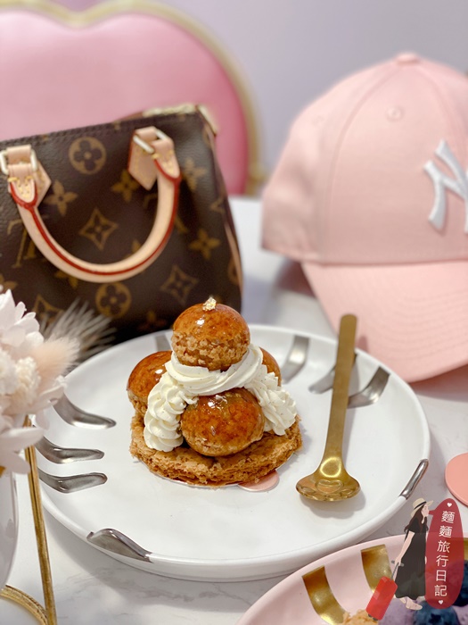 聖多諾黑也是店裡的招牌甜點,底部是酥脆的千層派皮,派皮上放著焦糖泡芙,在縫隙上補上奶油餡,一樣很好吃!