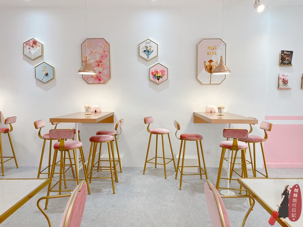 店裡空間很寬敞,整間店都是白色、粉色、金色打造!左邊是高腳椅座位區、右邊是桌椅座位區,總桌是有七、八桌,可以容納滿多人!