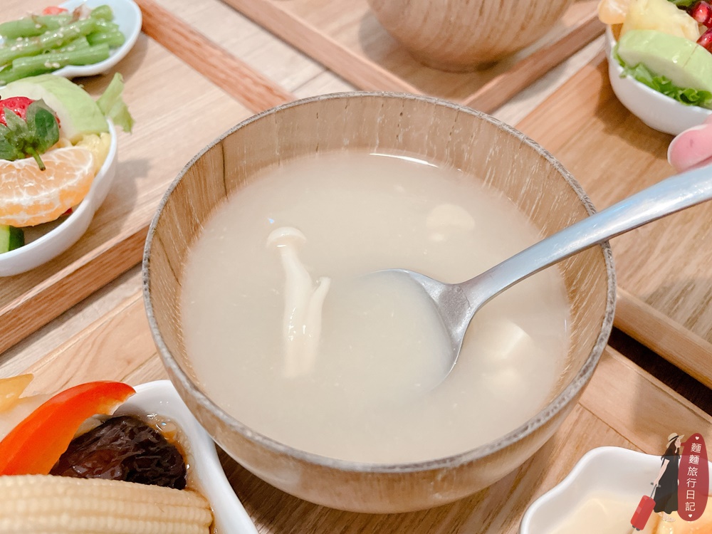 味噌湯是甜鹹甜鹹的那種,湯裡面有豆腐跟美白菇。