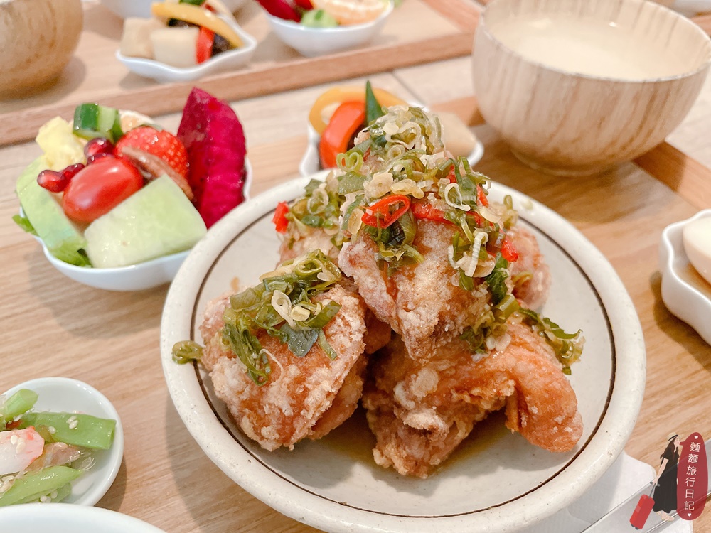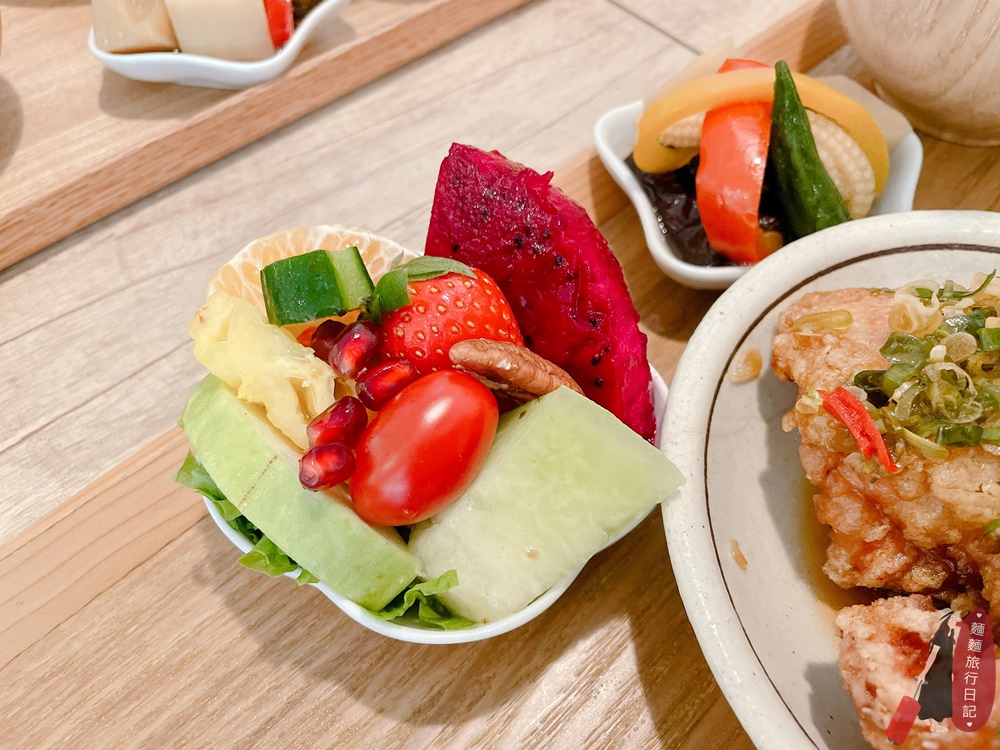 本週提供三種主餐,我們各點了一份!這是蔥醬炸雞,套餐的白飯使用的是日本越光米,米飯粒粒分明,配菜有三種,分別是糖心蛋、日式小菜料理方式的四季豆美白菇、蔬菜佃煮,另外還有一碗美白菇豆腐白味噌湯,飯後水果盤!